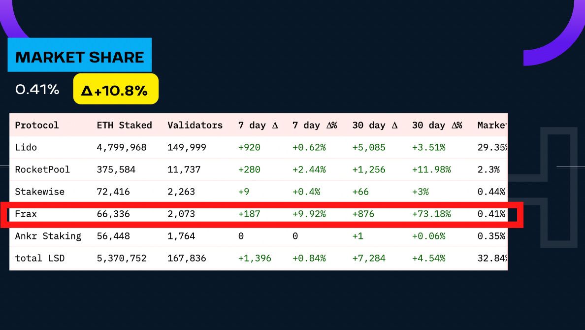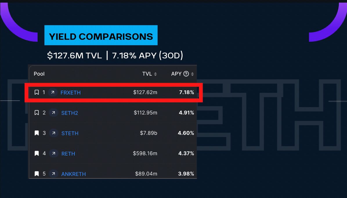 Here we layout the LSD market landscape.  Obvs, we have Lido in the lead with 29% of the market but you can see here that Frax REMAINED the highest 30-day delta in the group, at +73% so far.  The massive pump deposits this week led to a 10% increase in market share for frxETH, which sits at 0.41%.  And thus we have our first flippening with us overtaking Ankr Staking.  It’s not official-official yet since there’s a 1 week or so delay of validator set up, but next week I’m sure we’ll overtake Stakewise and be in the top 3!  Let’s keep fighting the good fight!  On the yield landscape, frxETH pretty much dominates with a 7.18% and the closest competitor is Stakewise at 4.91%.  We are the best game in town so come get some of this gud gud!