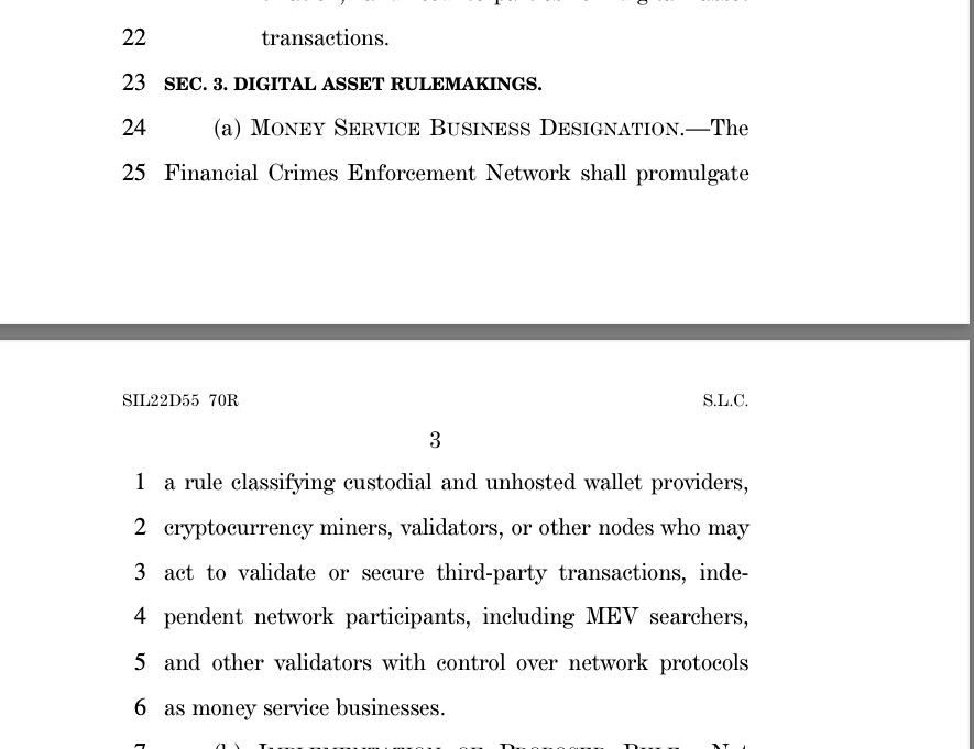 Forcing Bitcoin miners and PoS validators to KYC network participants has been a fringe demand for years now. This is the first time though that it has been proposed as a bill in the US congress. Maybe it's just a result of the current post-FTX milieu, but it's a direct shot across the bow of our industry and the millions of market participants globally who depend on these decentralized networks.