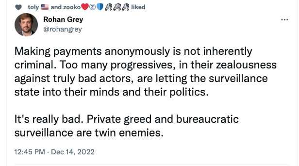 And this is why Sen. Warren’s and Marshall’s bill is such a travesty of the law. It would compel open source developers to write specific code to satisfy KYC regs, otherwise they would face jail time. Code is free speech. The state cannot stop or punish someone for publishing code. The OFAC sanctions this year showed how poorly thought out the action was and scores of innocent privacy-loving individuals who had committed no crimes were caught up in its scope.
