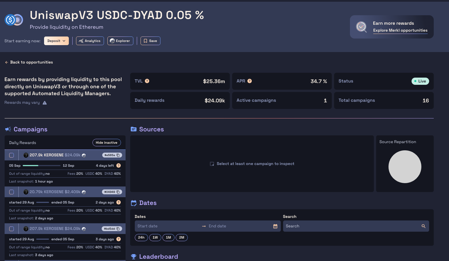As of writing, the DYAD-USDC pool on Ethereum is printing a massive 34.7%.