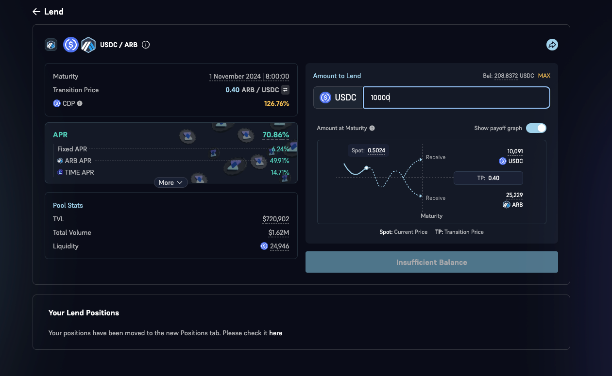 In the case above, you would lend USDC to the pool. If the price of ARB was lower than .40 on November 1, 2024, you would get ARB at the TP rate. If the price is above .40, you simply get your USDC back.