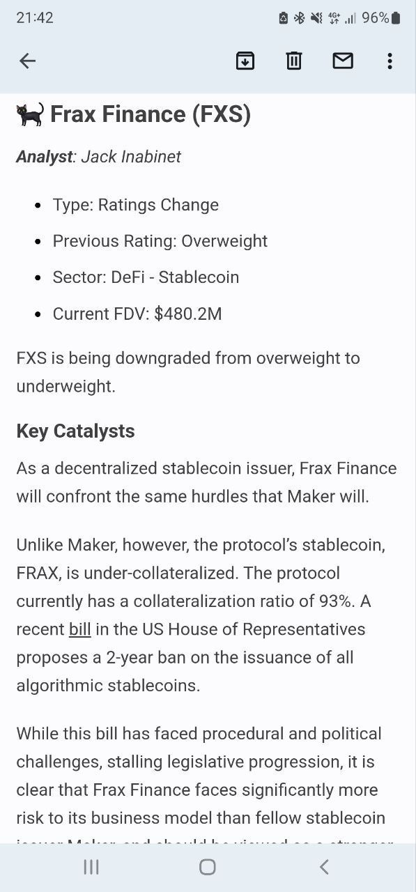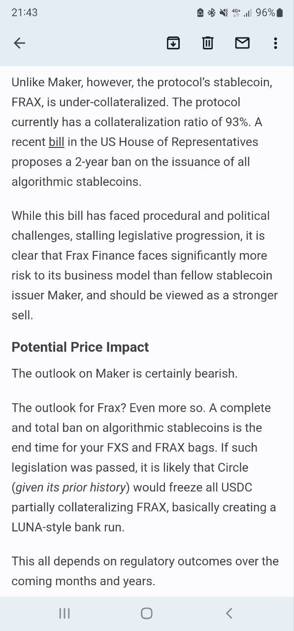 In the above screenshots, their intern analyst Jack derived his opinion about the performance of FRAX on the potential impacts of upcoming proposed stablecoin legislation from US congress. There are currently 3 bills being considered at the moment and it's unclear whether they will pass in 2022.