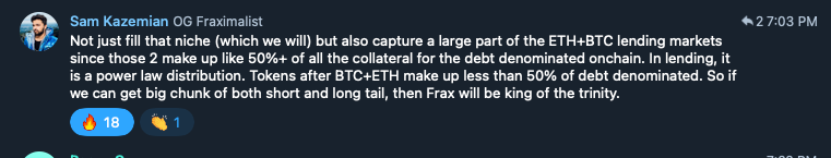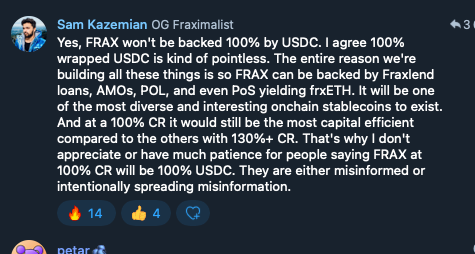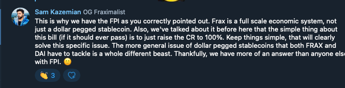 I don’t see the forthcoming regulatory regime as a negative for Frax. There might be some backlash against “algorithmic” stablecoins, but we always have the ability to raise the CR to 100%. It won’t mean “wrapped USDC,” rather a suite of products that provide for full collateralization. The addition of Fraxlend + POL is a huge step towards that reality if necessary.