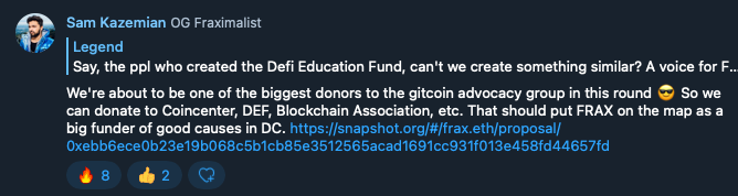 The latest Gitcoin round just ended and FRAX was one of the largest donors to good causes. We’re using our profits to fund regulatory efforts to protect the protocol.