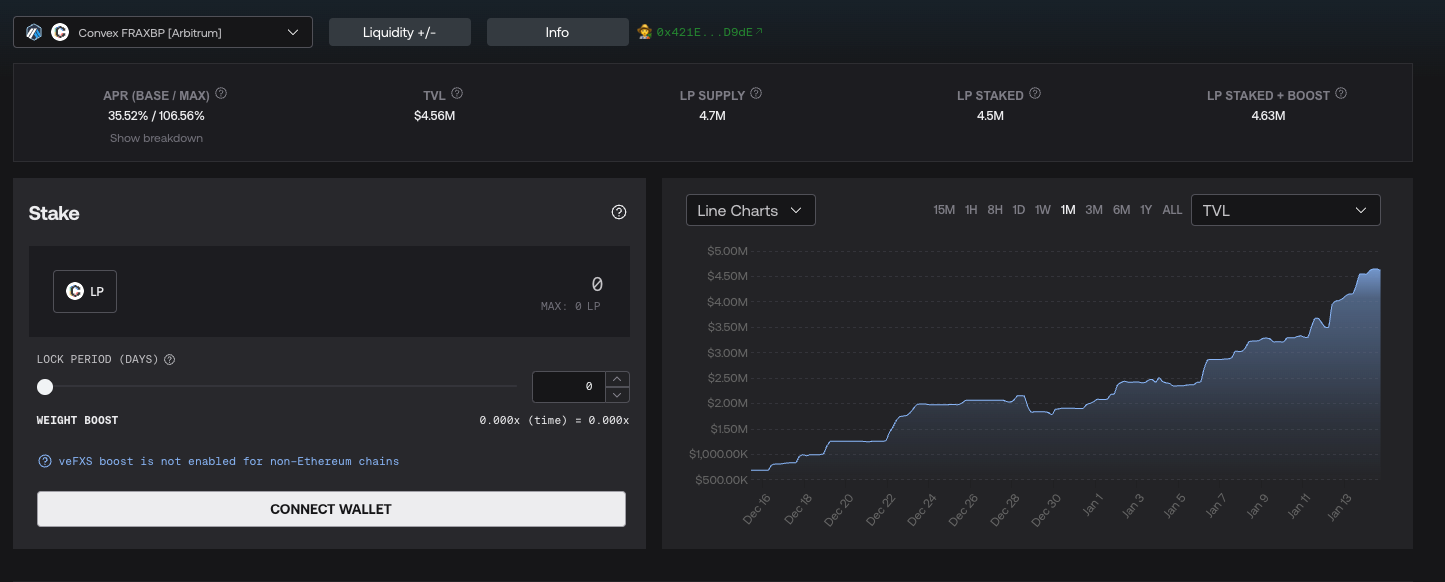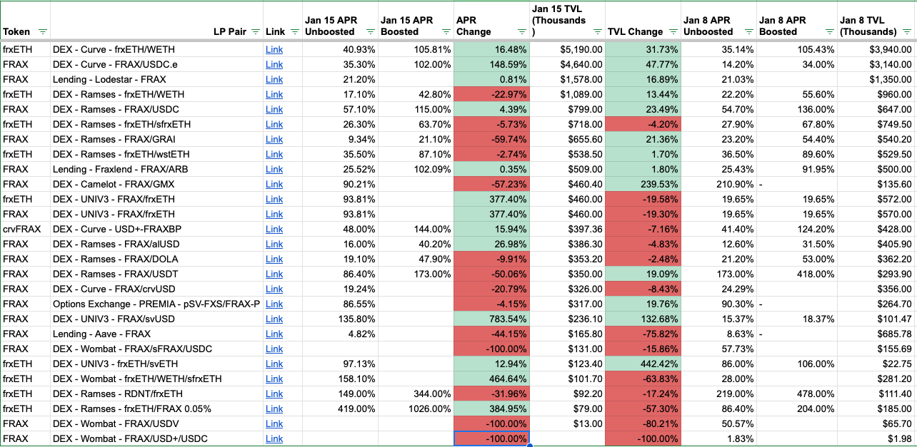 Over the last week, the FRAXBP, which consists of USDC and FRAX, had the biggest TVL change, growing more than $1.5 million. Additionally, the yields increased in response to TVL to 35% unboosted and 100% fully boosted with a max lock in Frax's staking system.