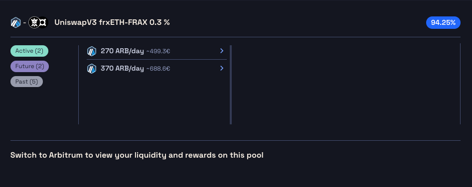 This pool has tripled its yield from last week and is now offering 95% APR. This pool is supported by Merkl, run by Angle on Arbitrum. The pool is receiving 500 ARB daily.