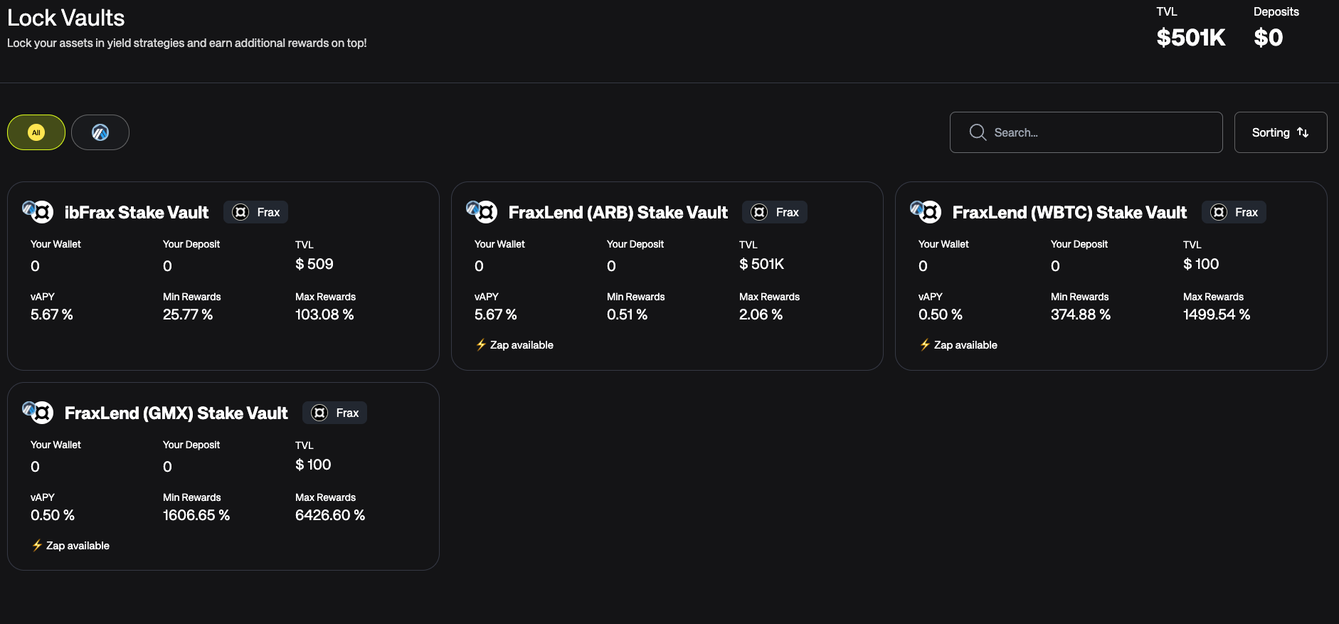 Vaultcraft is a new protocol that takes FRAX and locks it in Fraxlend for up to 6 months. Frax just launched their new GMX and WBTC pools and the yields are quadruple digits right now. While there is not that much TVL, these pools will be ramping up over the next few weeks. If you are one of the first to deposit, you'll get some high yields until they fill up.
