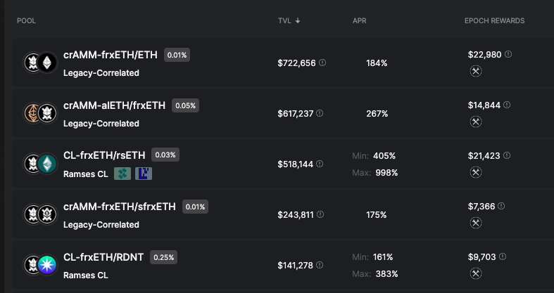The big winner this week was Ramses, with pools frxETH/WETH, frxETH/rsETH, FRAX/alUSD all growing by 232%, 202%, and 31% respectively in TVL. All three of these pools are ETH denominated and are printing three figures worth of APR.