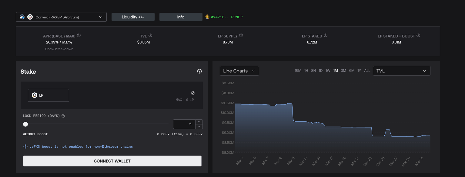 Notably, the FRAXBP is great for large TVL deposits, with over $8m in deposits and a 20% unboosted yield.