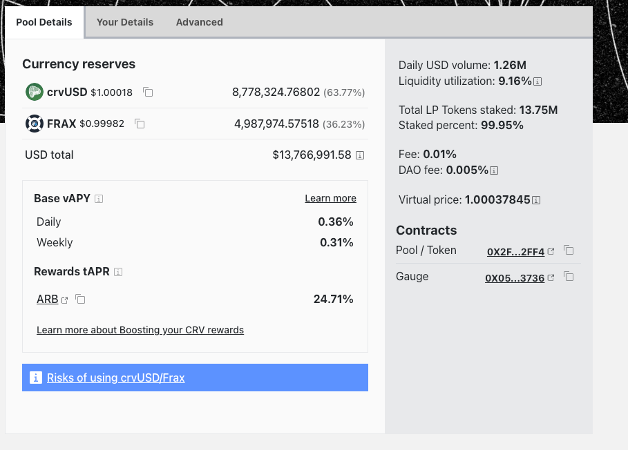 Curve's coming in HOT this week. The crvUSD/FRAX LP jumped up a 264% in TVL, to $13m. That's the largest 1 week increase we've seen this cycle. Yields are 24%, which is large for this size of pool.
