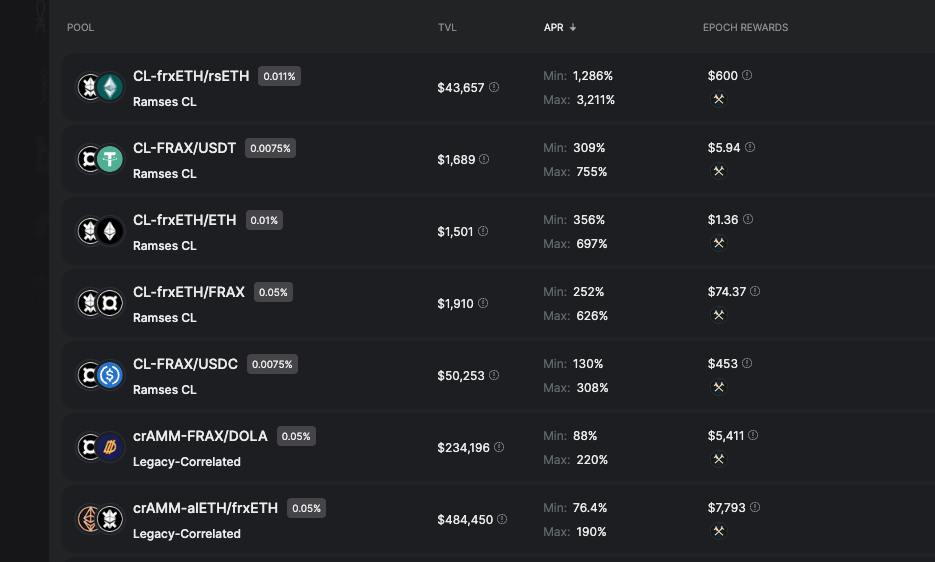 Some pretty incredible opportunities from Ramses Exchange this week. The FRAX/DOLA pair has the largest TVL to APR right now, boasting 88% unboosted yields. Coming in hot right behind that the alETH/frxETH pair is getting 76.4% APR.