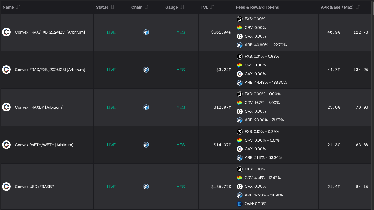 The core Frax supported positions with gauges are also super hot right now. The FXB pairs are crushing still, both with triple digit yield for max boosts. The frxETH/WETH LP is earning 63.8% boosted, which is massive if you want to park long term liquidity on Arbitrum for ETH.