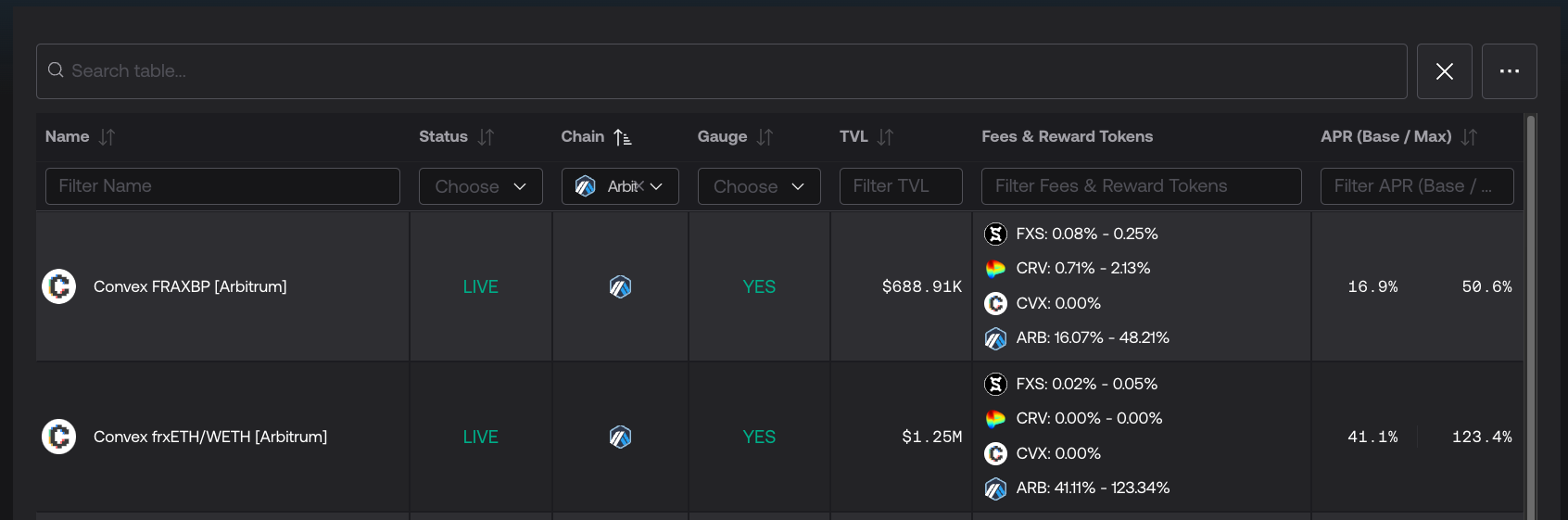 Yields for the Convex Arbitrum pairs are high through Frax staking. Right now you can stake ConvexFRAXBP for 50% max boost and ConvexfrxETH/WETH for 123%!