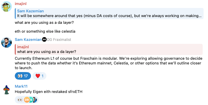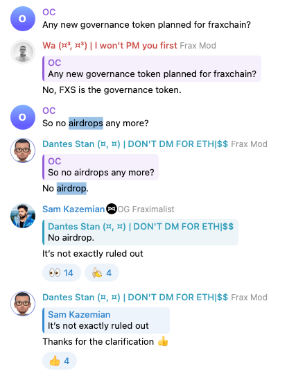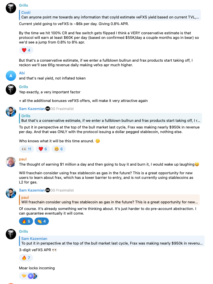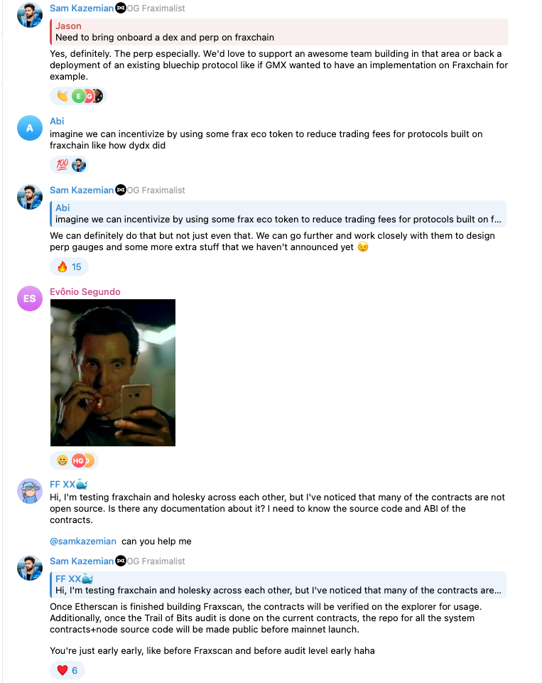 Nothing is confirmed. But lots of πŸ‘€ and πŸ’― reactions from Sam this week on a multitude of TG messages shows the team is internally discussing potential incentive structures for the launch of Fraxchain.