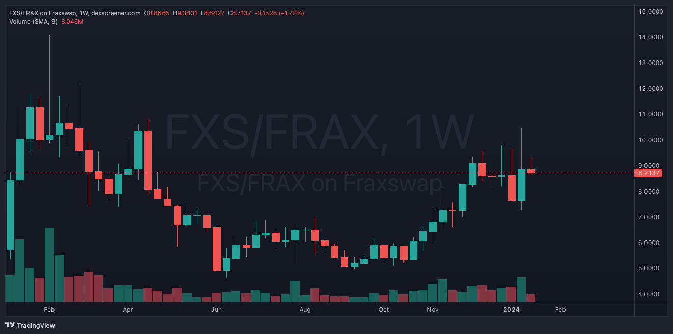 On the weekly chart FXS is still near the top of its range for the past year. This consolidation period might be broken once Fraxchain launches in February, as it would drive massive new interest into Frax's L2 for 2024