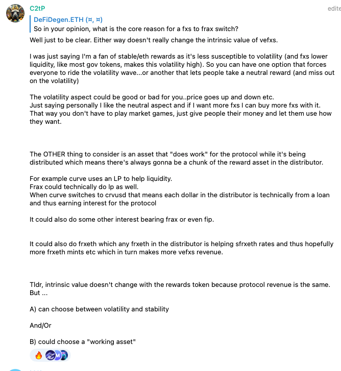 There was a healthy debate in the telegram chat this past week about how rewards should be distributed in the Frax's ecosystem. Right now all of the profits are in by Frax are used to buy back FXS and then distribute that to veFXS.
