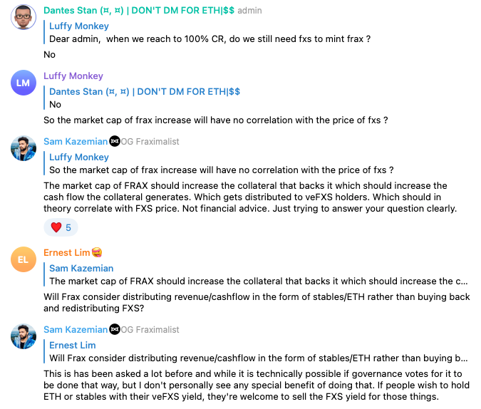 The topic came up when Luffy Monkey asked what happens when CR hits 100%. He was asking where the value of FXS would come from once FXS was not used to mint FRAX.