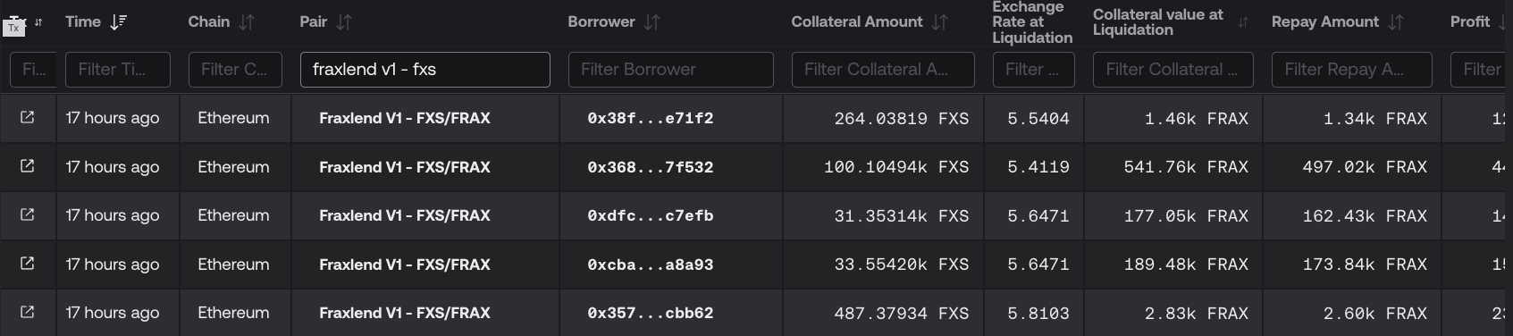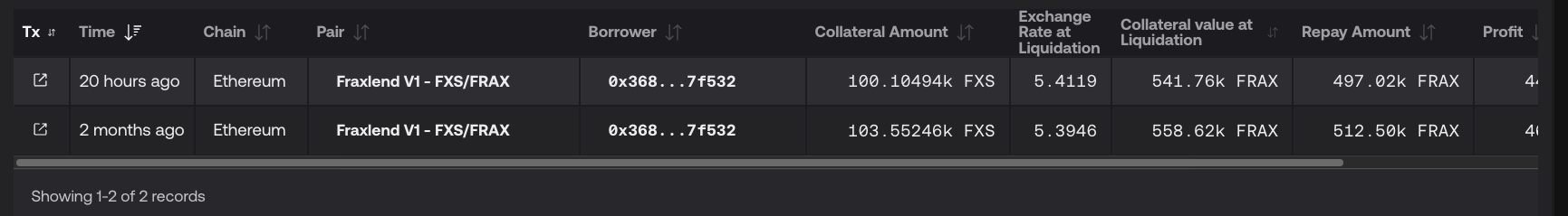 What's super interesting is that anon 0x3689c216f8f6ce7e2ce2a27c81a23096a787f532 has been liquidated for 100k TWICE in two months..... hmmm. What's going on? In their first loan, they used 103k FXS to borrow $558k FRAX. and in their second loan, they used 100k FXS to borrow $541k FRAX. 0x368 was the FIRST to be liquidated yesterday as well. We're going to leave our conspiracy hats off here...