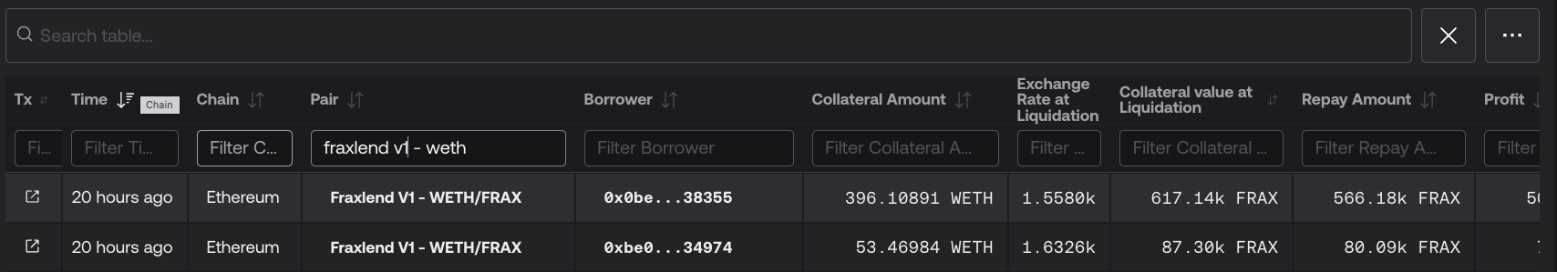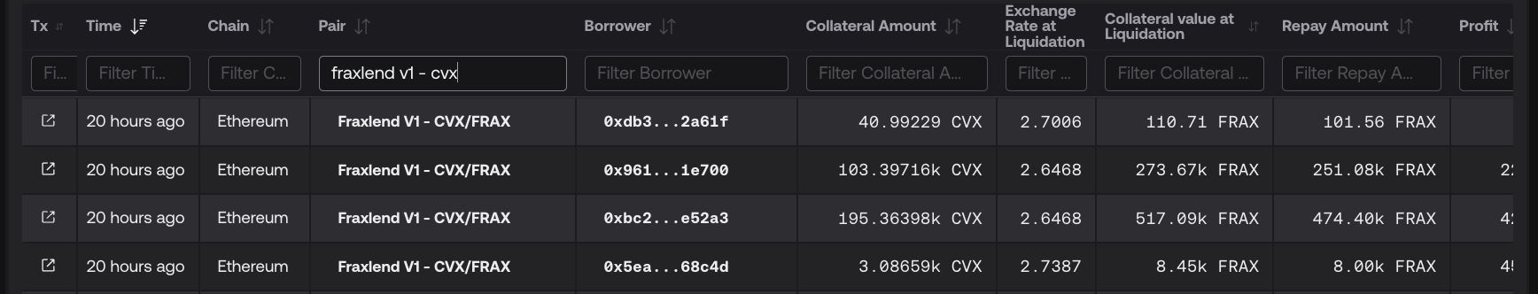 Other notable liqudiations yesterday was 2 lots of 300k CVX total that had over $700k Frax borrowed.
