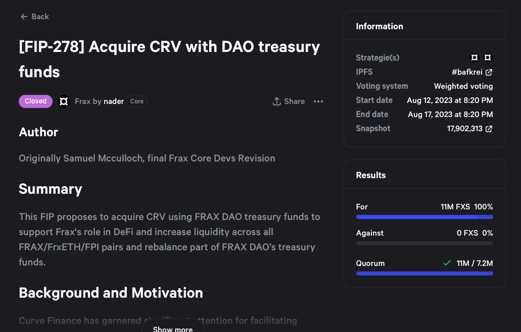 Speaking of Michael, Frax DAO voted to purchase $1m worth of CRV in what @curvecap said would be potentially "the last deal made." The vote was pushed over the line with 11m veFXS votes. Frax most likely will swap it to cvxCRV or stake it themselves to use for future gauge voting rewards for its liquidity pools.