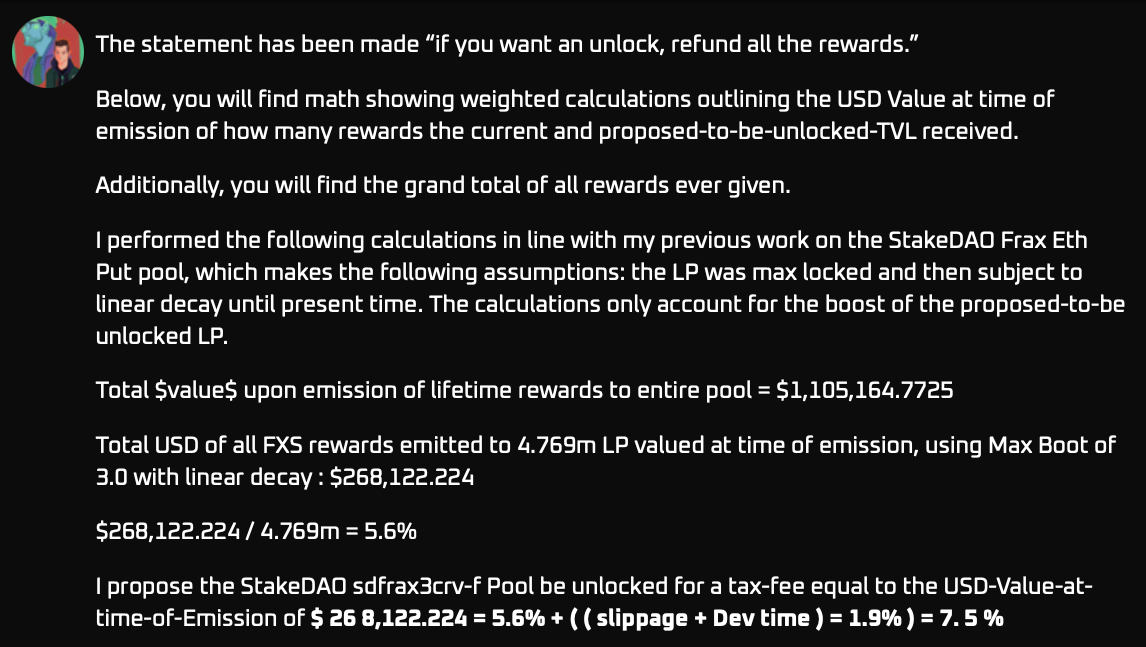 Additionally, TG member Luke has been working on extracting a massive amount of data to determine rage quit fees for how much FXS was paid out to the sdFrax3CRV-f pool over the last 2 years.