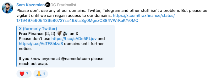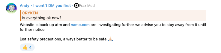 Sam Kazemian quickly made an announcement to not touch the front end domain and that all contracts and other forms of communication were safe. Quickly, we found out that someone had gained access to Frax's back end on name.com and had changed the DNS.