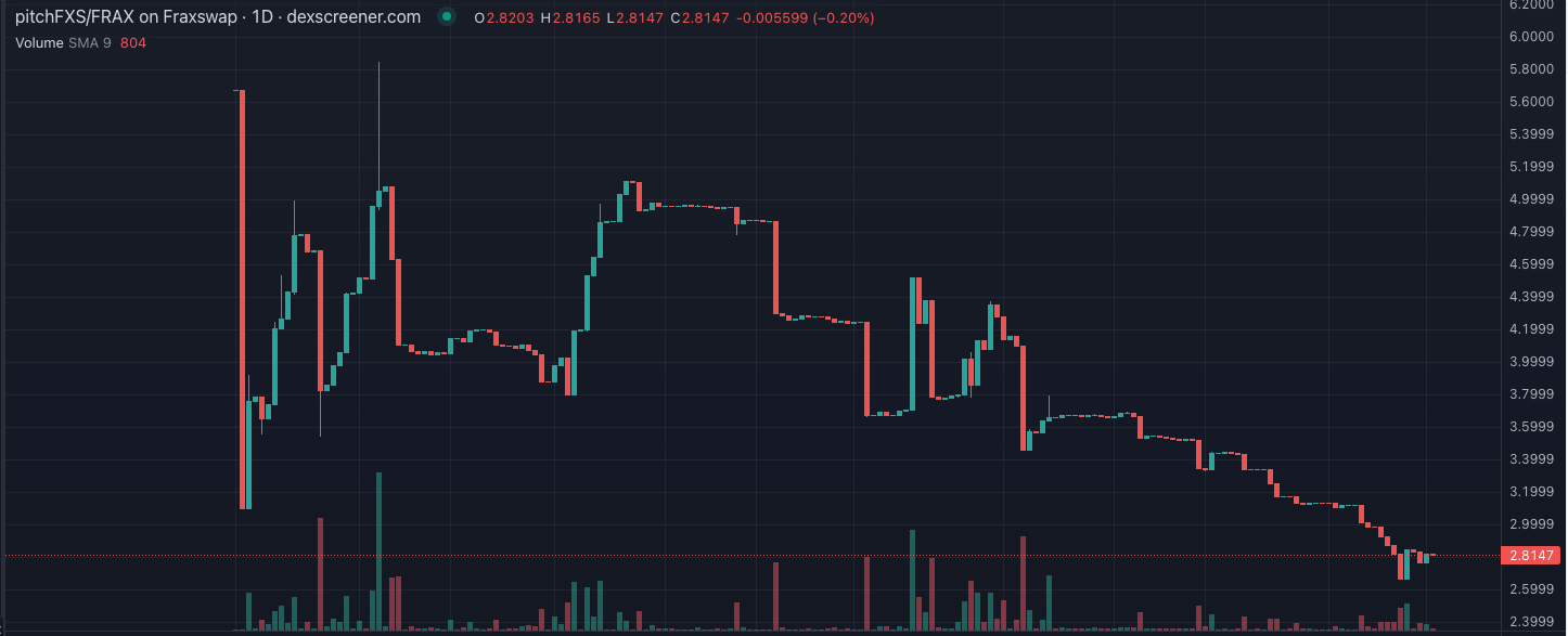 Currently, the price of PitchFXS is 2.81, a greater than 50% discount for 4 year locked FXS. NFA, but buying FXS sub $3 might be a good opportunity for those who believe in long term holding.