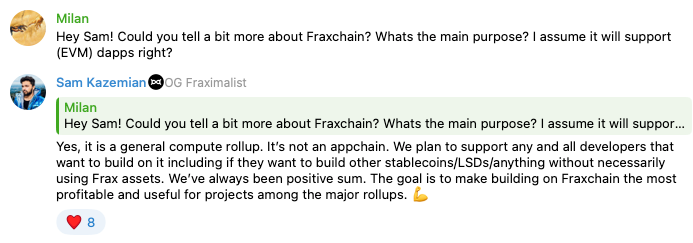 Additionally he gave more info on Fraxchain, saying "it is a general compute rollup. It’s not an appchain." and also that it should have a diverse variety of apps built on it.
