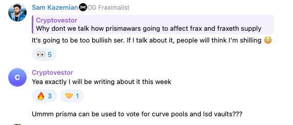 Prisma Finance yet again raised their deposit cap for LSD's across the board this week and also enabled ve-locking for their PRISMA token. With triple digit rates the first few days, the sfrxETH cap was hit in under 24 hours after raising.
