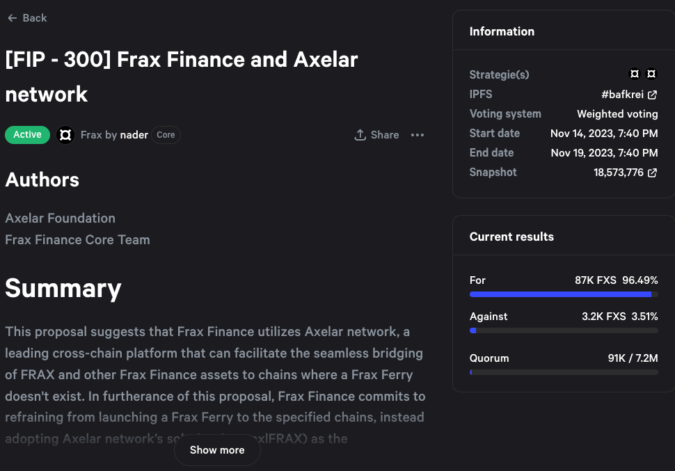 Axelar and the Core Team proposed to adopt Axelar network’s representation of Frax Finance tokens on chains where a dedicated Frax Ferry is unavailable. This adoption will enable the seamless transfer of Frax Finance tokens between supported chains.