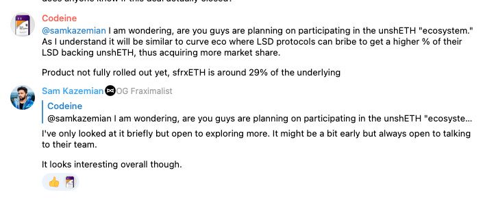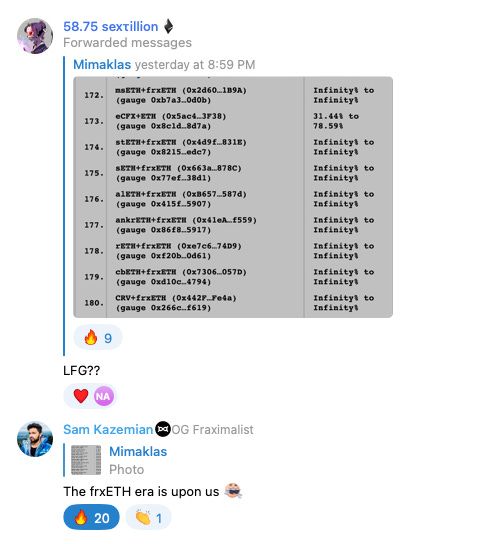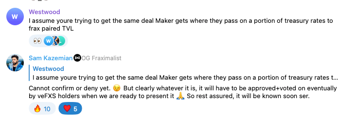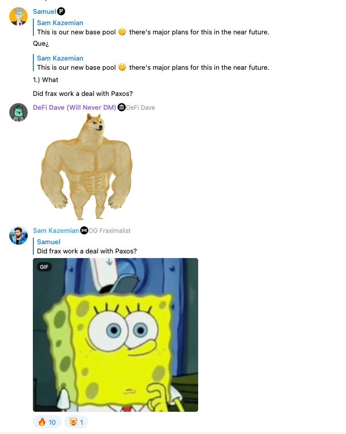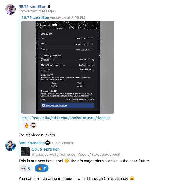 On Wednesday night, Sam Kazemian dropped some serious alpha in the telegram chat. While the information had been public on the Curve forums for two weeks now, this was the first major announcement to the Frax's community about the new USDP basepool.