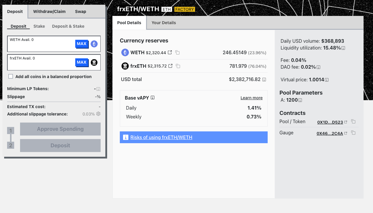 Currently the staking rate for the pool is 13.1% base and 40.31% fully boosted with a 3 year lock. That's not bad for an ETH+ETH Stablecoin pair in our opinion. We're optimistic that TVL will grow more over the next several weeks and hopefully break $10m by the end of the incentive program.