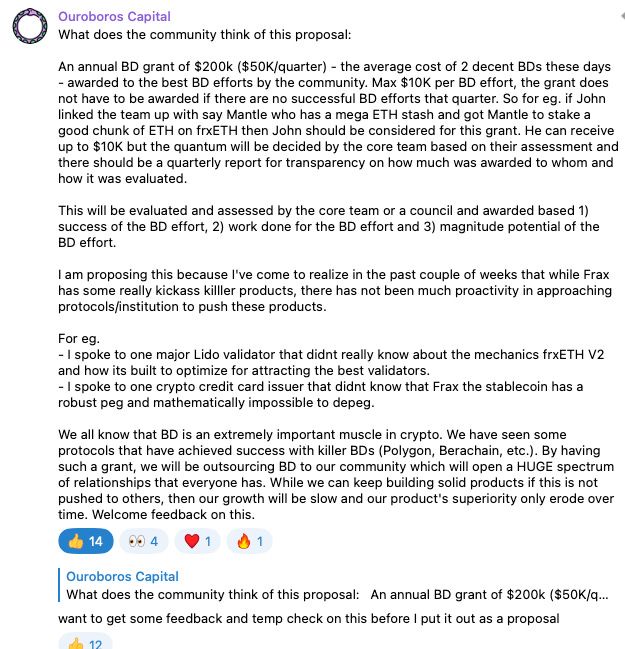 Grills is back again with another Rage Quit vote for the Gelato FRAX/DAI pool that has $2.9m of locked liquidity. He wants to implement a 20% rage quit fee for those who want to exit early. There is only 500-ish days left, so it might pass this time.  He writes:
