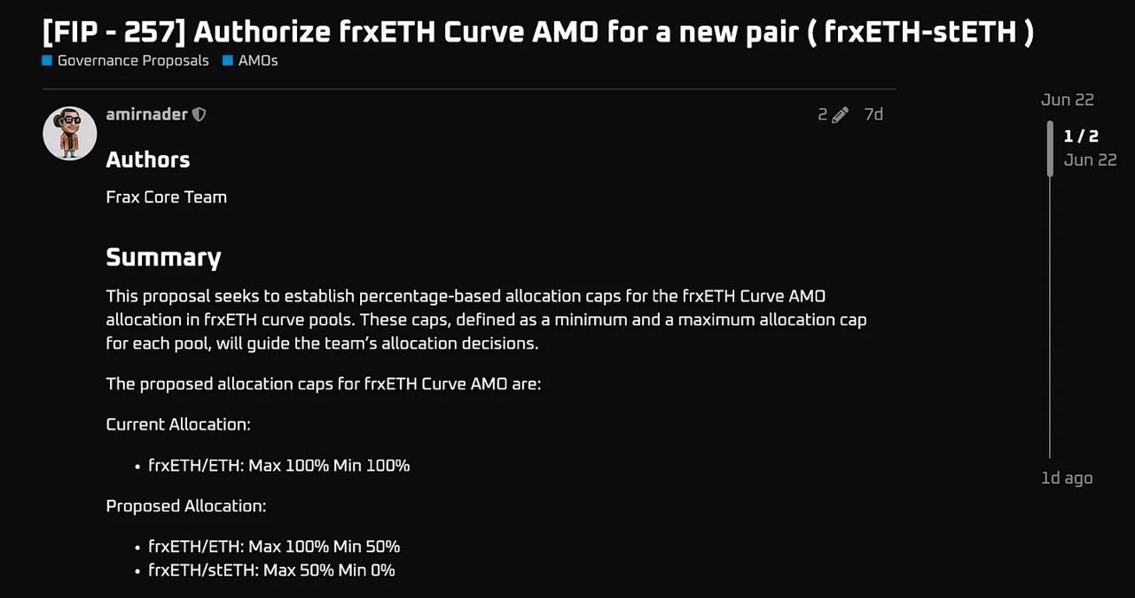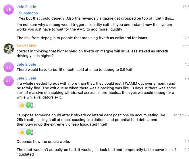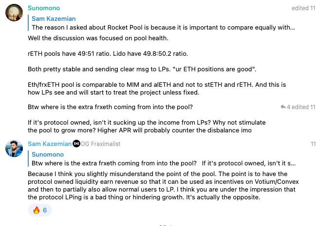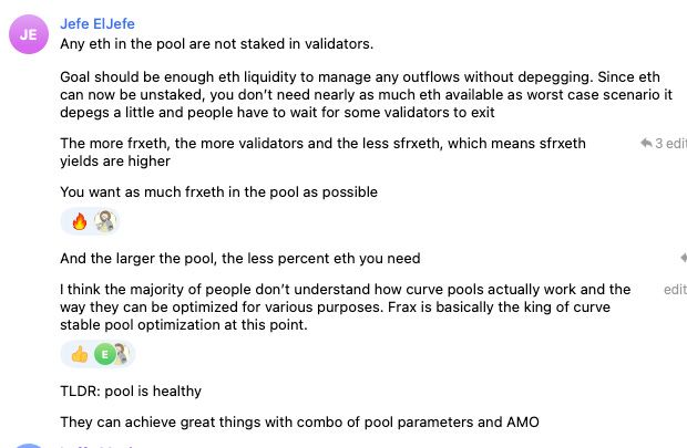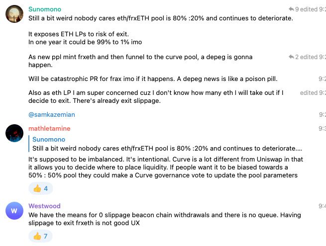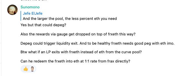 Sunomono, expressed his concerns about the imbalance in the frxETH/ETH Curve pool’s. Mainly arguing that the 80:20 imbalance brings a large risk and would cause frxETH to depeg. The imbalance of the pool is the main strategy of the AMO which  Frax intentionally implements. Ideally, you would want to attract more ETH and so, the design of the imbalance was specifically done so that whenever there is an imbalance, Frax would slightly push up the bribes to incentivize more people to put more ETH into that pool.