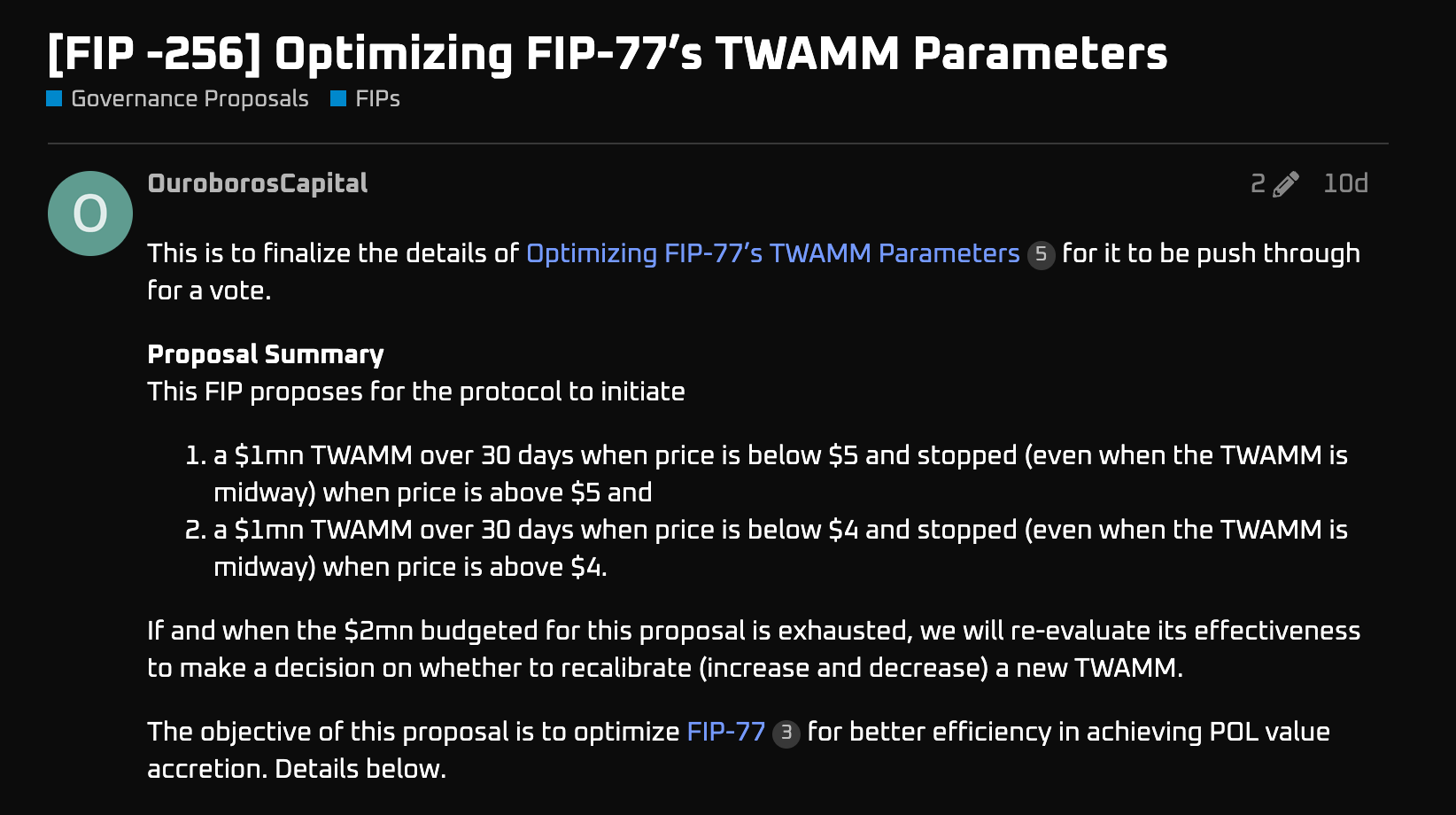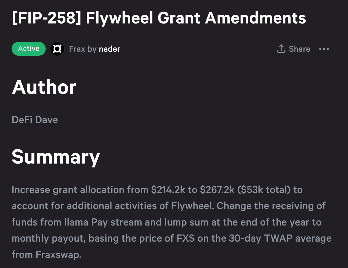 As mentioned in last week’s article, Ouroboros’ proposal to optimize FIP-77s TWAMM Parameters has been passed! Essentially, this would allow for Frax to buy back more FXS when its cheaper rather than linearly purchasing FXS regardless if the market price is high or low. The community appreciates having an activist investor and experienced fund manager who genuinely cares about the future of Frax to propose and execute this strategy. In fact, we are excited to be hosting Ouroboros on the Flywheel podcast next week so make sure to subscribe to our substack to be the first to know when its released!