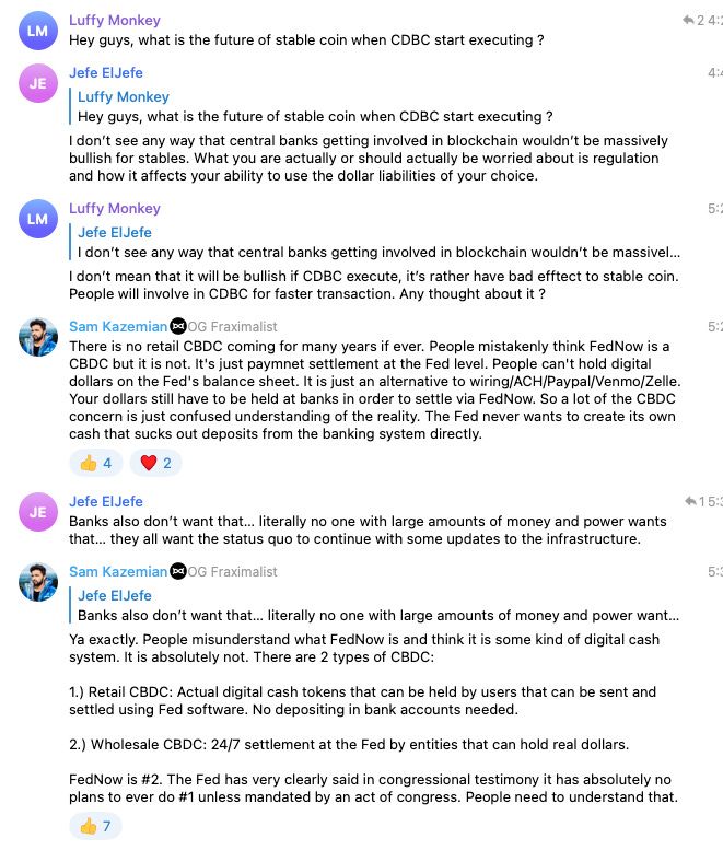 With this breaking news, the Frax community was quick to begin the discussion within the main chat. Sam came in to say that there won’t be any retail CBDC coming into the space for the next couple of years, if ever. He continued by explaining the two types of CBDCs.