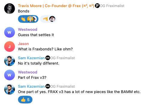 This week Travis Moore teased and Sam confirmed that Fraxbonds will be included in the highly anticipated FRAX v3. As Sam mentioned, these types of bonds will be quite different from the bonding model which we have seen with OlympusDAO’s OHM where users are able to trade various assets for OHM at a discounted price, these bonded assets then provide extra liquidity and reserve assets to the treasury. We are awaiting further information on the mechanics of Fraxbonds as well as when it will be deployed.