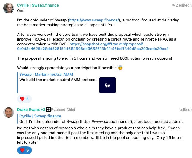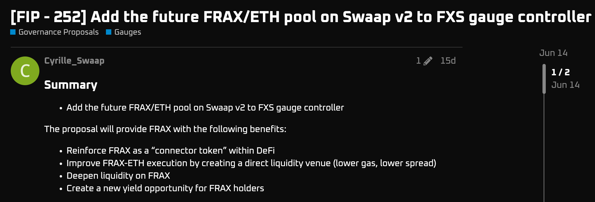 Swaap is a protocol which focuses on delivering the best market-making strategies for all types of LPs. Their recent proposal to add the future FRAX/ETH pool on Swaap v2 to FXS gauge controller was passed. What does this mean? It will reinforce FRAX as a ‘connector token’ in the DeFi ecosystem, improve the FRAX/ETH execution through the creation of a direct liquidity venue which entails lower gas and lower spread, deepen the liquidity on FRAX, and create a new opportunity for FRAX holders to earn yield. Frax core team member and Fraxlend lead Drake Evans gave his public endorsement and said that Swaap was the only protocol out of the dozens that truly has a product that can help grow Frax. At the finish line, the proposal to add the Swaap gauge would go on to pass.