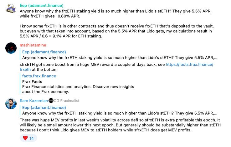 Well, the USDC drama caused the markets to go into a tailspin for a weekend, one of the benefits of all of the on-chain activity was that sfrxETH鈥檚 yields for this week were absolutely insane. Frax鈥檚 validators received more than 80 ETH from MEV and Tips during the calamity. You would have returned to their normal levels, but it is exciting to see how validators will perform in adverse market conditions.