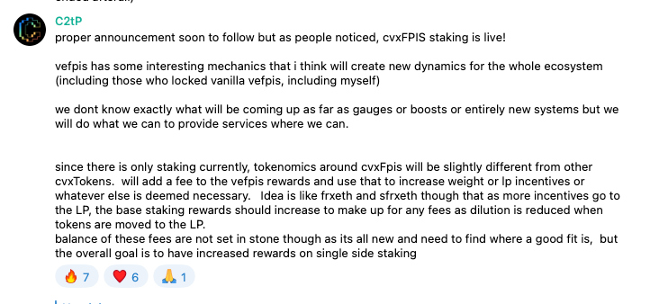 C2tP dropped in the chat this past week and announce the launch of cvxFPIS staking. Convex doesn't really know yet how they're going to use the pools because there's not that much documentation in the moment, but the protocol is committed to ensuring some of the highest yields for veFPIS that you can get.