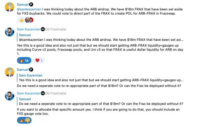The Abitrum airdrop was this week, and Frax hit it big, receiving more than 500,000 ARB for their service on the network. Yesterday, Flywheel producer Samuel McCulloch, proposed that we match the ARB with FRAX from the FXS buyback fund. This would be added as liquidity to both Curve, Uniswap and Fraxswap.