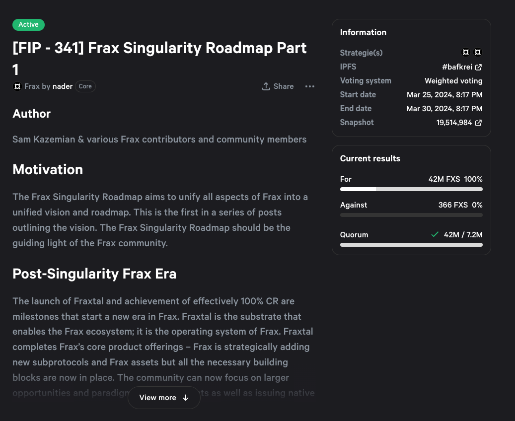 With just one day left to vote, Frax's Singularity Roadmap has reached quorum and is guaranteed to pass at this point. So far it has received more than 42m veFXS votes to only 366 no votes. This near unanimous decision means that the FPIS merger will begin soon after it passes, the fee switch will turn back on as Frax has hit 100% CR and also that the new FLE liquidity engine will be activated on Fraxtal.