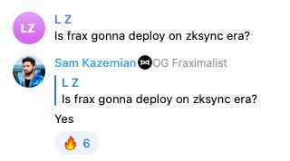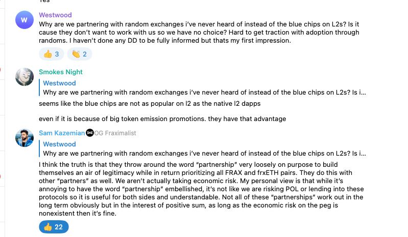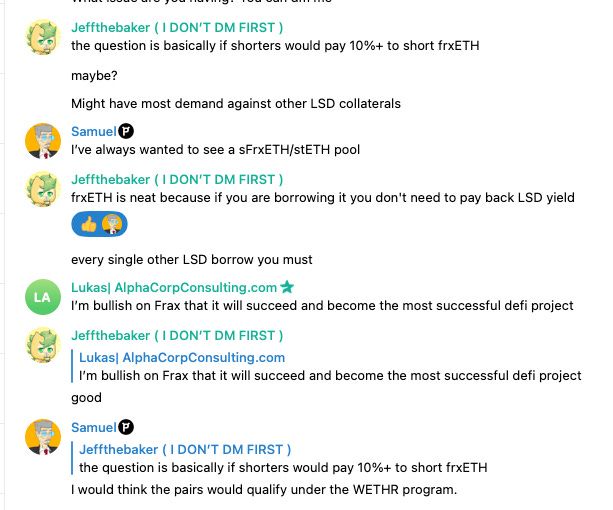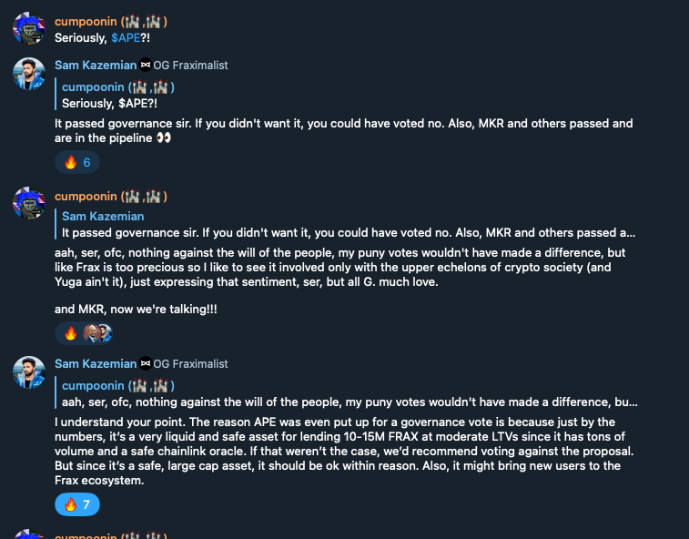 This week saw the addition of new collateral assets in Fraxlend. Based on a previous governance vote APE, LINK, LDO, UNI, AAVE, and MKR are all to be added to Fraxlend. Additionally they will receive Lending AMO support. APE was the biggest shock for the Telegram chat. However, some timely words put the issue to rest.