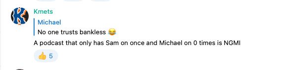 We love the Bankless team, but one slip from host David Hoffman about Lido receiving a Wells Notice sent the token sliding 7% on the day. The entire market is testy and looking for reasons too short, with multiple lawsuits having been started this past month. Some questions came up about Frax’s exposure (none), but the real chad Kmets left this comment: