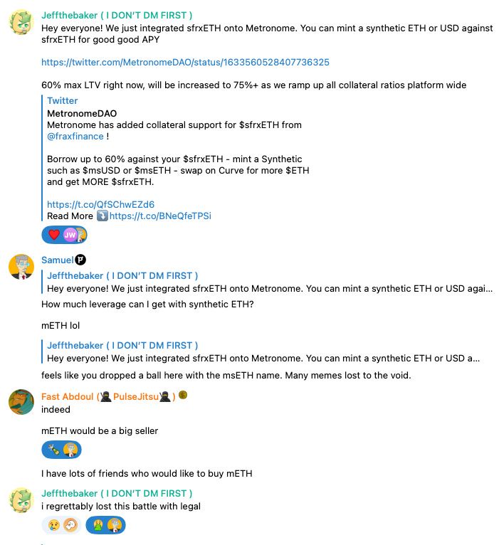 Green Jeff dropped in the chat to announce the launch of msETH, a synthetic ETH generated using sfrxETH as collateral. This is the first synthetic product allowing wrapping of sFrxETH and we think it could be big. We’re excited to see how it grows.