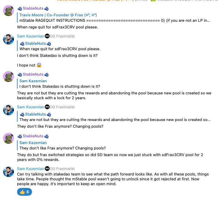 It took a few votes, but the Mstable rage quit proposal finally passed. Existing LPs can now exit out of their locks for a 20% fee. Based on some calculations in the group chat, the fees Frax would earn would be equal or greater than how much FXS was distributed to the pool.