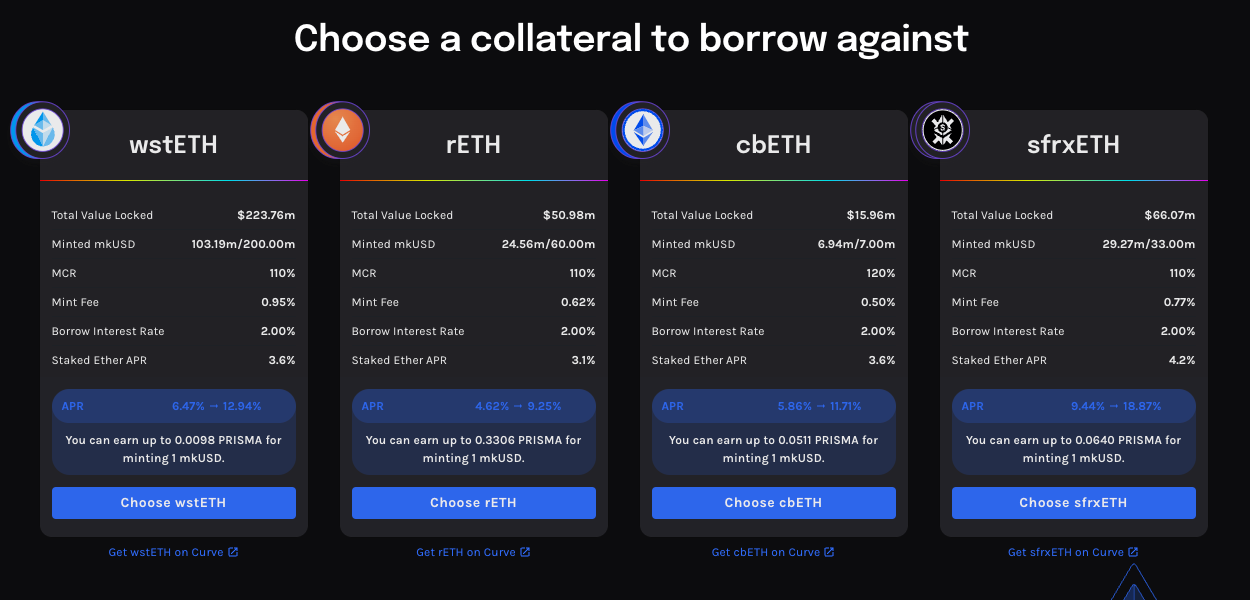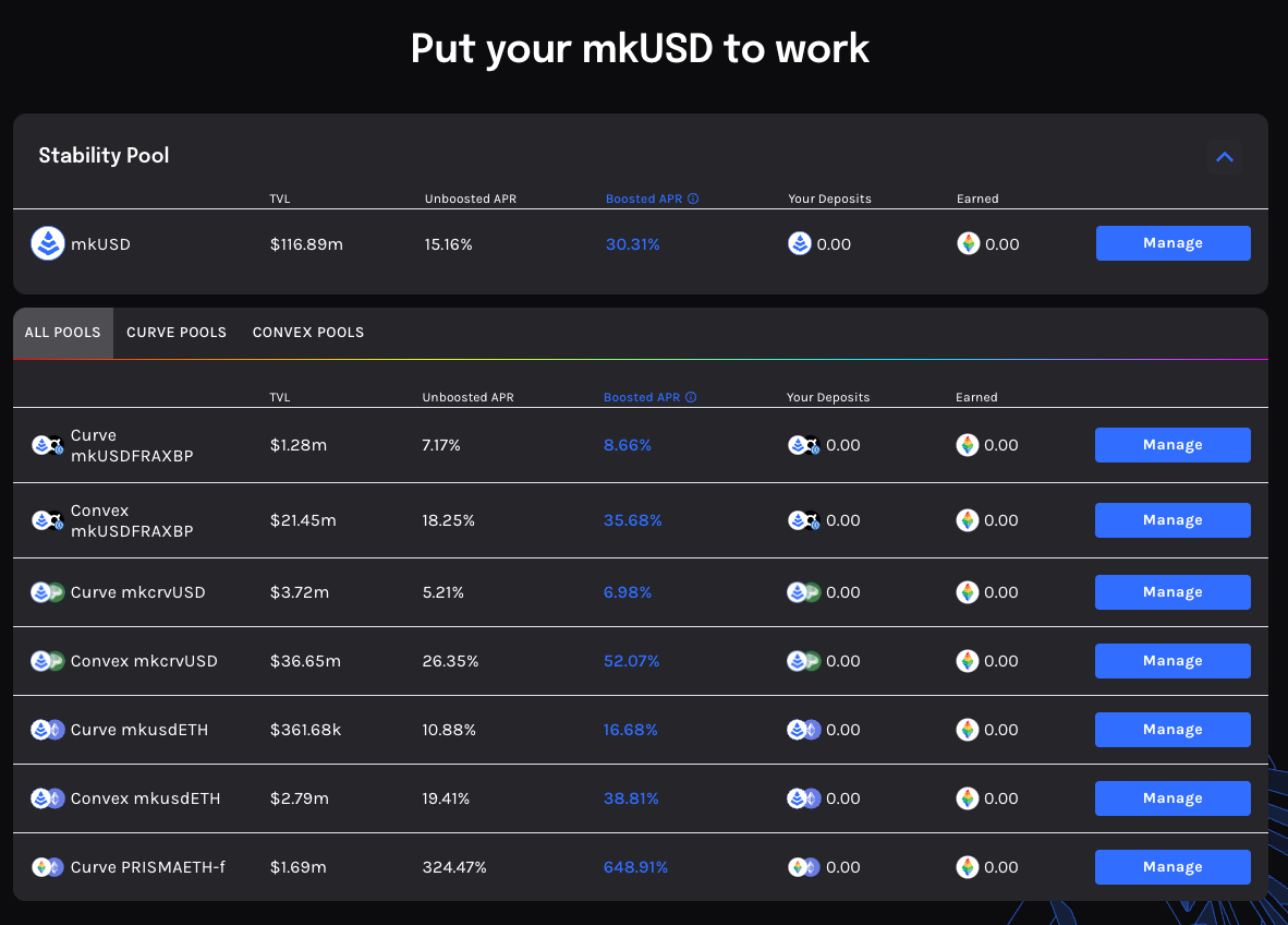 Yields have been hot for PRISMA supported Frax assets. These first 4 weeks will be the highest yielding portion of token distribution, with 2,25m Prisma tokens doled out. The Convex mkUSDFRAX BP still has boosted rewards of up to 35%, making it one of the most attractive farms in DeFi right now.