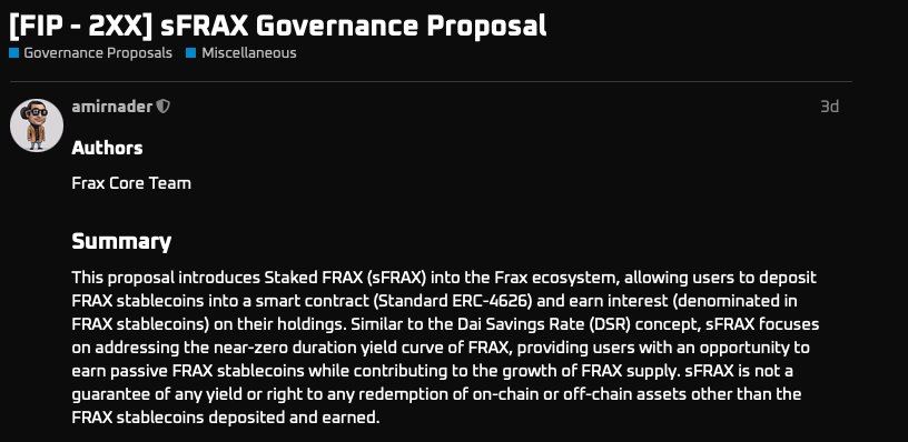 The Frax Core Team has proposed a new product called Staked FRAX (sFRAX) that allows users to deposit FRAX stablecoins into a designated smart contract, enabling them to earn yield on their deposits. The function of sFRAX seems to address the current yield curve challenges faced by FRAX, drawing parallels to the Dai Savings Rate (DSR). Expected rates for sFRAX will start at 10% and then decline to 5% at scale.