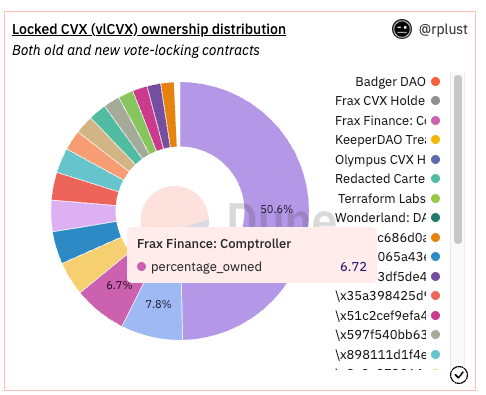 Currently, Frax owns 6% of all Convex, staking it  as Vote Locked CVX and it also has a huge chunk of veCRV in its treasury. What this means is that Frax can direct millions of dollars of incentives every month towards its own liquidity pools on Curve.finance. Each week it uses its power to direct new emissions towards its preferred pools through the Votium bribe platform.