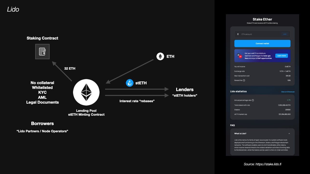 Use the loan analogy as a lens, Lido node operators are able to borrow ETH with zero collateral requirements, with the strict assumption that all ETH rewards earned from staking, minus fee, are returned to lenders (stETH holder) as interest through rebasing.